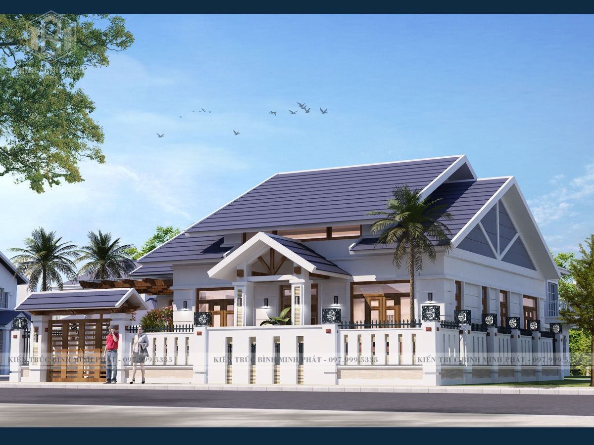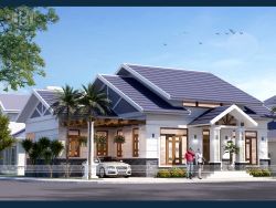 Biệt thự có thiết kế mái Thái dáng chữ A xếp chồng, đua rộng ra ngoài, lợp ngói xanh coban trẻ trung, tinh tế, hài hòa với cảnh sắc thiên nhiên. Hệ mái Thái với độ dốc cao, tôn thêm vẻ cao ráo, bề thế và thanh thoát cho tổng thể công trình biệt thự 1 tầng. Các họa tiết trang trí cũng được giản lược, chỉ sử dụng các đường phào chỉ, xoắn ốc tại cửa sổ áp mái và consol đầu hồi để mang đến vẻ đẹp tinh tế, sang trọng cho công trình.