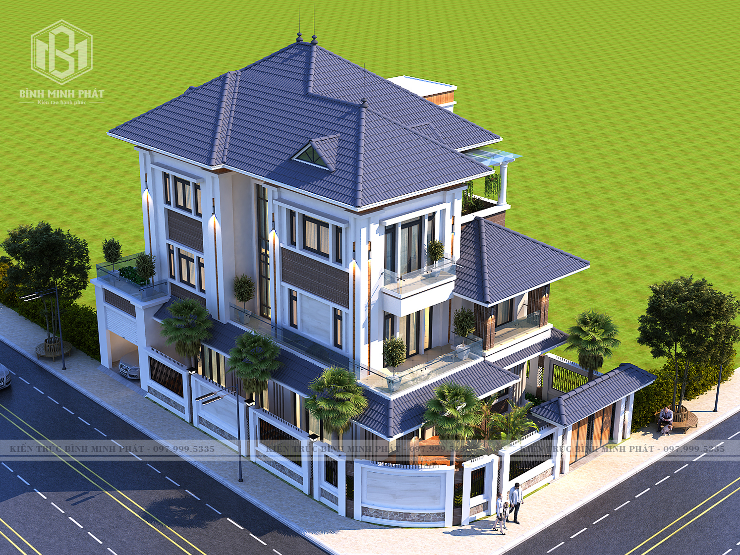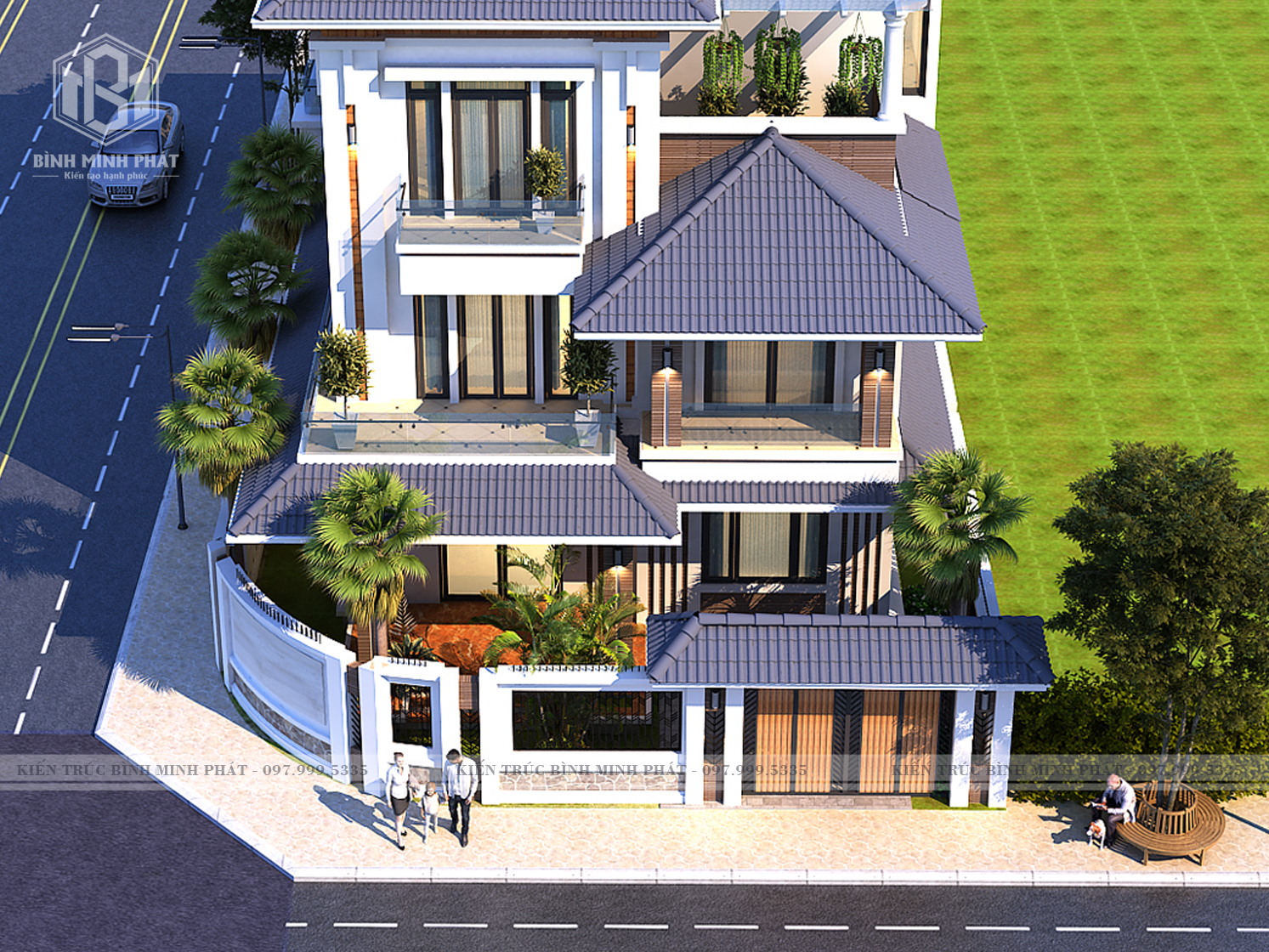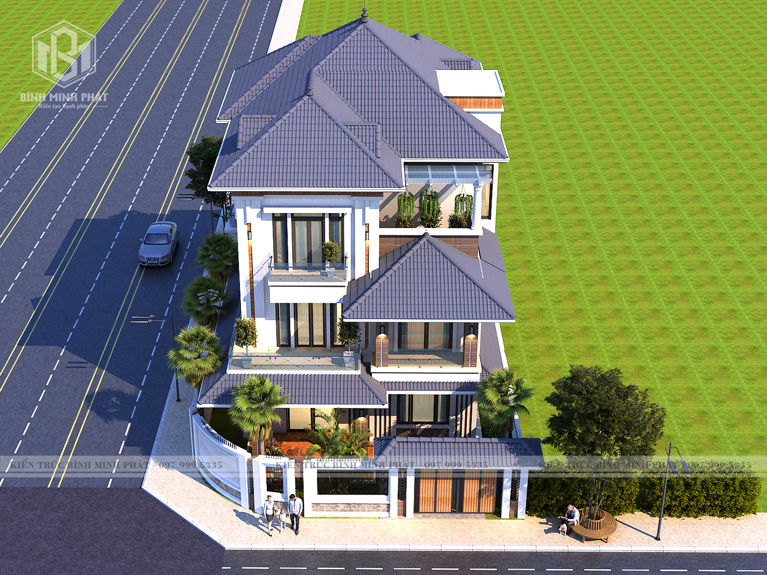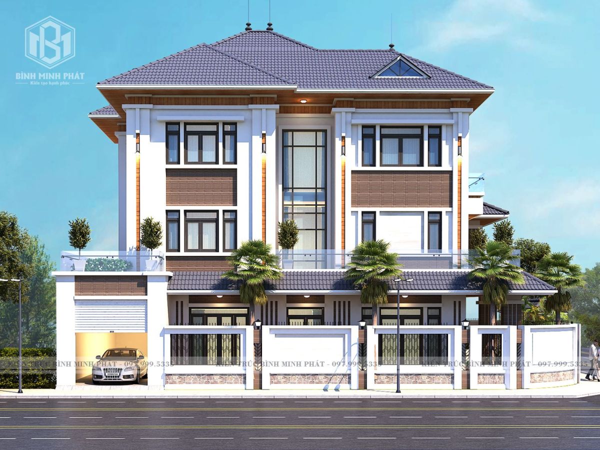 Phối cảnh mặt tiền căn biệt thự mái Nhật 3 tầng hiện đại tại Quảng Bình BT315