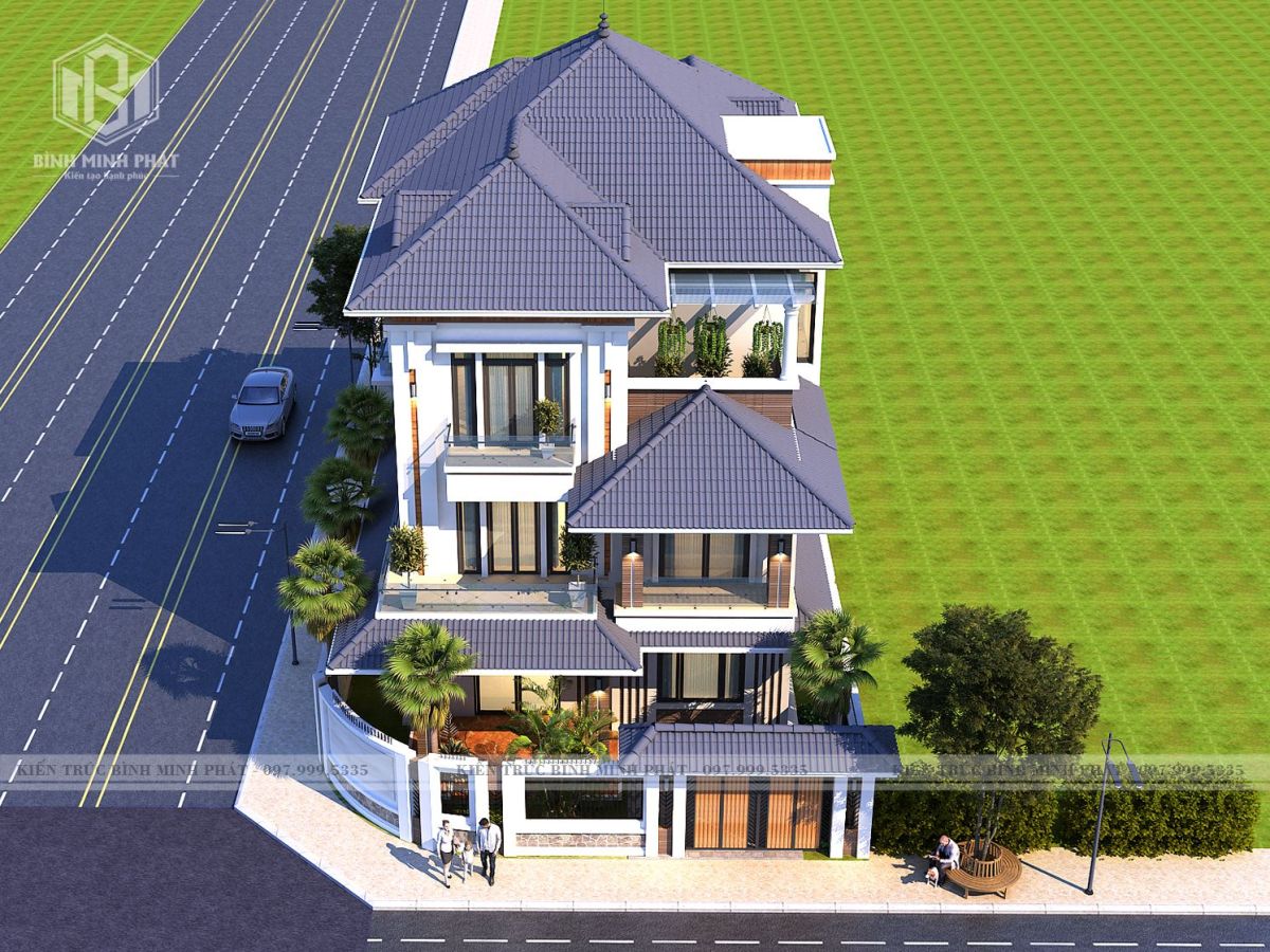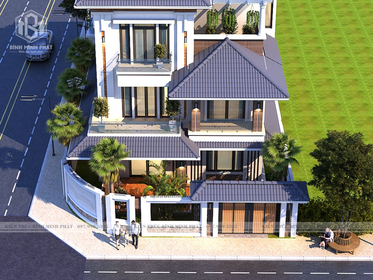 Góc chụp từ trên cao xuống của căn biệt thự hiện đại 3 tầng mái Nhật BT315