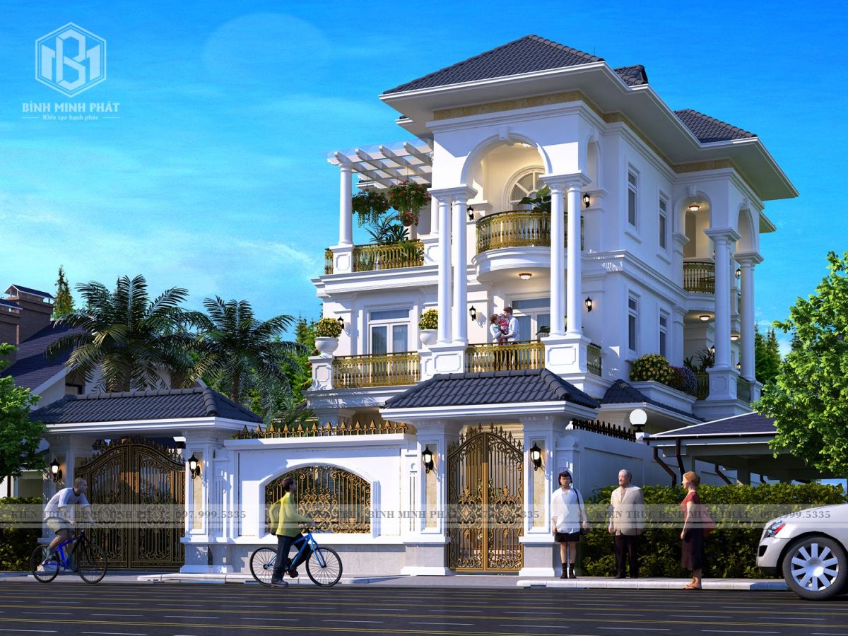 Mẫu biệt thự tân cổ điển 3 tầng mái Thái do Bình Minh Phát lên ý tưởng theo nguyện vọng của gia đình nhà Bà Tâm tại Quận Hải Châu-Đà Nẵng. Căn biệt thự có diện tích xây dựng mặt tiền 15m và chiều sâu 25m. Mẫu nhà biệt thự đẹp 3 tầng đẹp nổi bật trên nền trời trong xanh của thành phố Đà Nẵng đầy nắng và gió. Ở đó cảnh quan sân vườn được quy hoạch phù hợp. Từ đó làm nổi bật lên hình ảnh ngôi biệt thự mái Thái với phong cách tân cổ điển. Màu trắng của sơn tường với màu than của mái ngói kết hợp hài hòa với nhau mang đến sự tương phản màu sắc, đem đến không gian sống ấn tượng nhất cho gia đình chủ đầu tư.