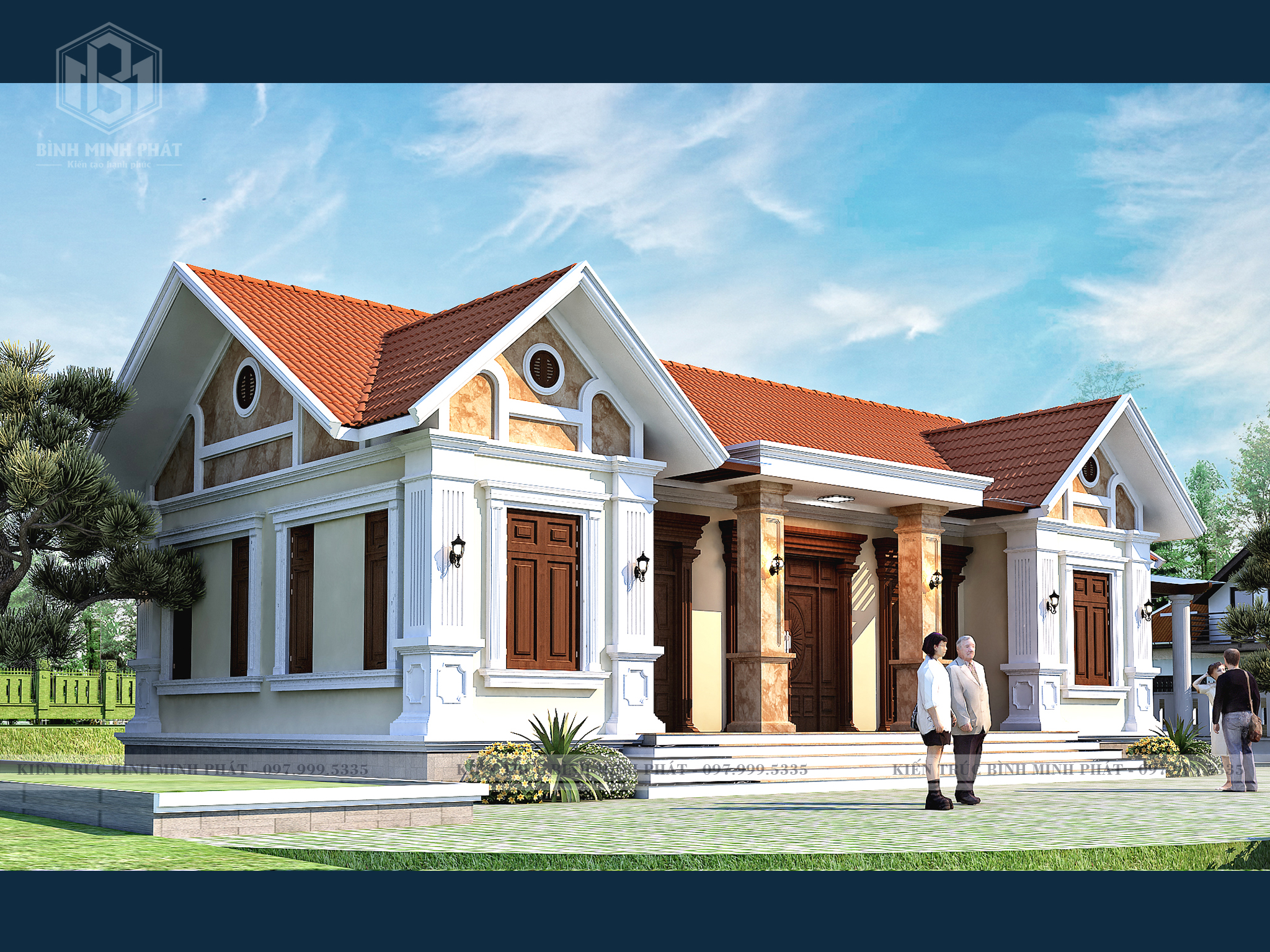 Cách thiết kế sáng tạo của biệt thự 1 tầng tân cổ điển đến từ việc lựa chọn một kiểu mái phù hợp. Bởi phong cách tân cổ điển nhưng có chút hơi hướng nhà ở truyền thống của người Việt Nam nên đòi hỏi thiết kế mái cũng cần phù hợp để tạo thành một tổng thể hoà hợp. Chính vì lẽ đó, các kiến trúc sư Bình Minh Phát đã lựa chọn thiết kế mái Thái cho công trình này. Mái đỏ tạo nên sự tương phản màu sắc độc đáo, tạo cái nhìn nền nã và dịu mắt cho nhà vườn.