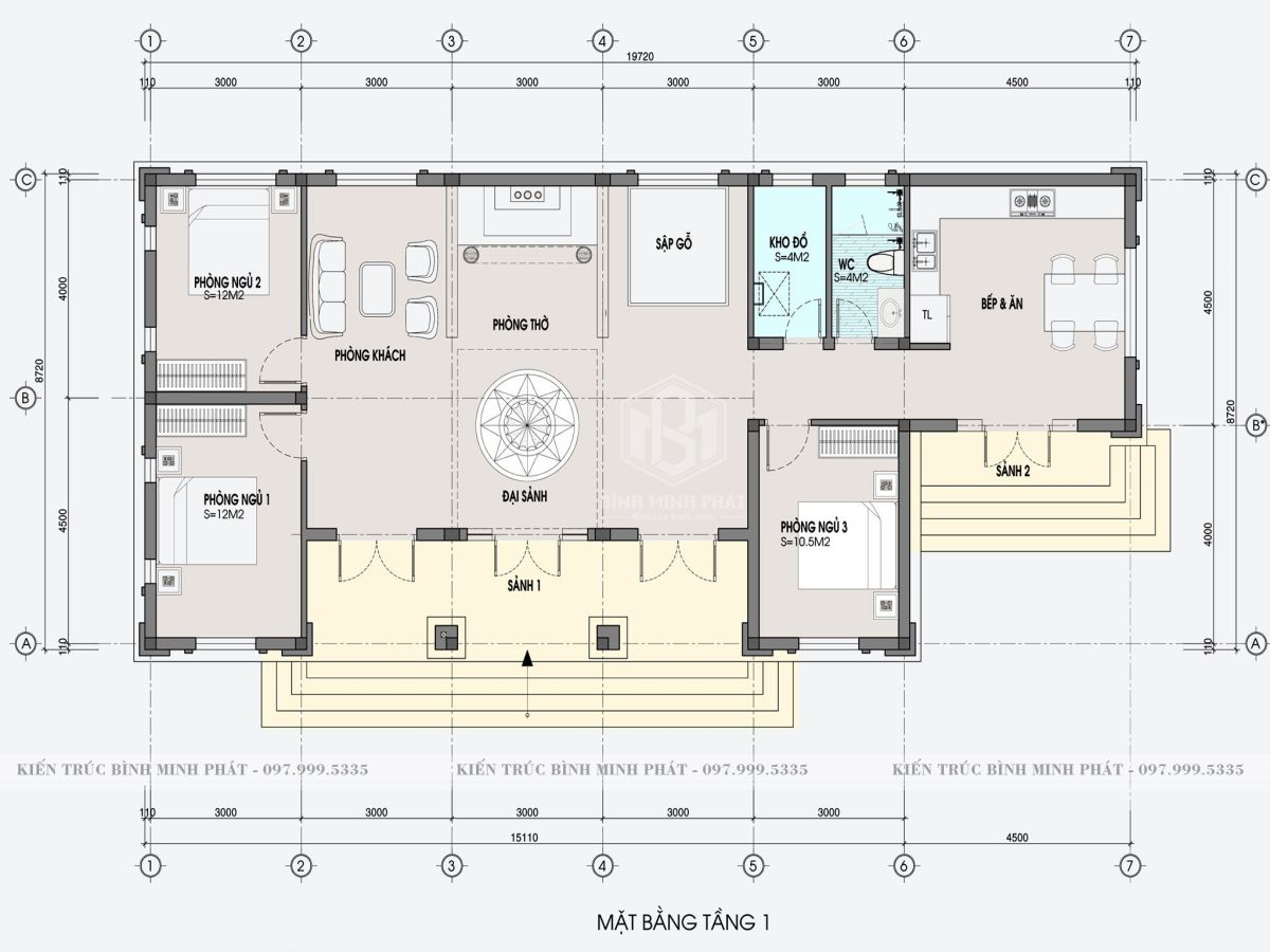 Gia đình ông Quang Tại Bắc Giang sở hữu một mảnh đất đẹp nên đã liên hệ với Bình Minh Phát nhờ tư vấn mẫu biệt thự mái thái tân cổ điển 1 tầng 300m2. Với công trình này, chủ đầu tư yêu cầu thiết kế 4 phòng ngủ để đáp ứng tối đá nhu cầu sử dụng. Xin mời bạn đọc cùng Bình Minh Phát tham khảo phương án mặt bằng công năng của mẫu thiết kế biệt thự 1 tầng tân cổ điển thông qua bài viết dưới đây.