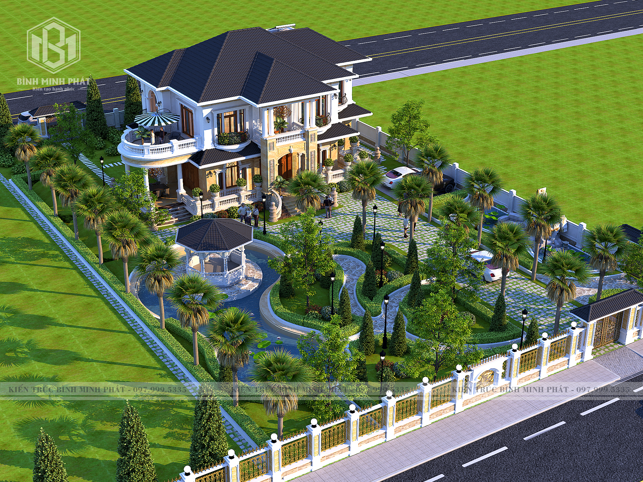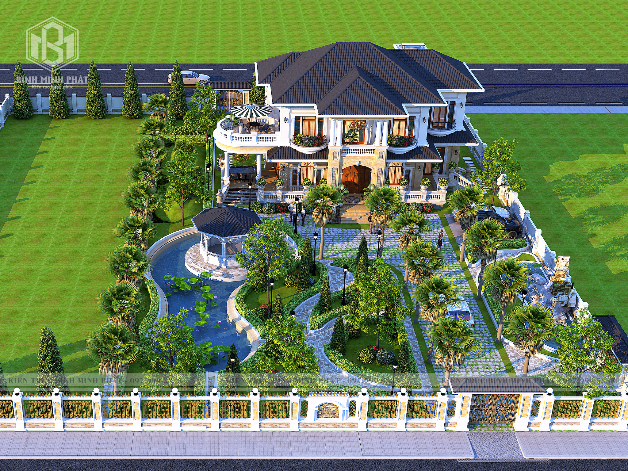 Thêm một hồ nước, vài khóm hoa và những chậu Bonsai để tăng thêm sự hài hòa trong cảnh sắc và một không gian tràn ngập sức sống cho ngôi biệt thự. Sảnh chính nổi bật với hệ thống trụ cột tròn doric giúp tạo sự chắc chắn, vững chãi và bế thề của căn biệt thự. Hệ thống các đường phào chỉ được chú trọng, hoa văn nhẹ nhàng, đem đến thiết kế sang trọng, mang đậm kiến trúc tân cổ điển. Ngoài ra, cửa sảnh chính được làm từ gỗ gõ đỏ cùng hoa văn nổi bật và phần kính thoáng, chính phần cửa này đã tạo nên điểm nhấn độc đáo cho toàn bộ không gian ngoại thất.