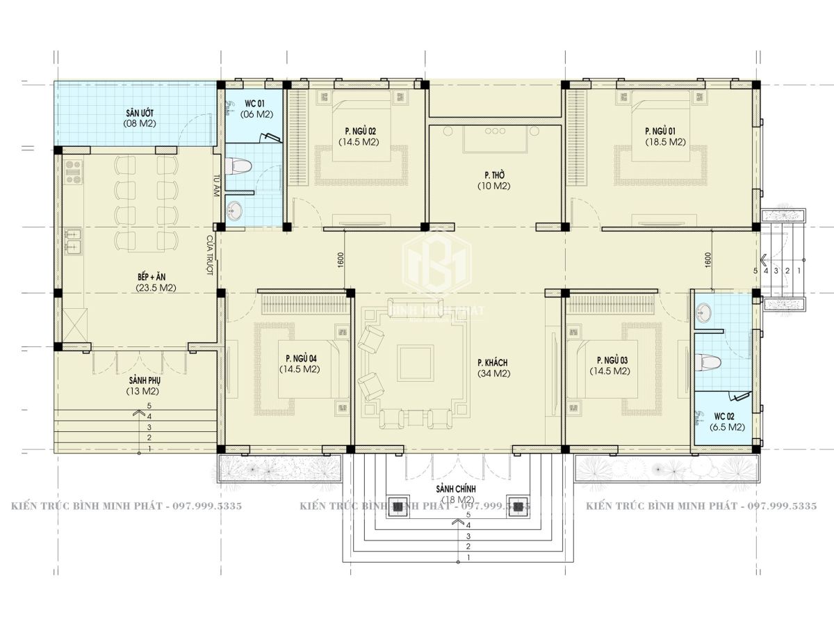 | Tầng 1 | Sảnh chính + sảnh phụ + 1 phòng khách + 1 phòng thờ + 1 khu vực bếp & phòng ăn + 4 phòng ngủ + 1WC + sân gia công |