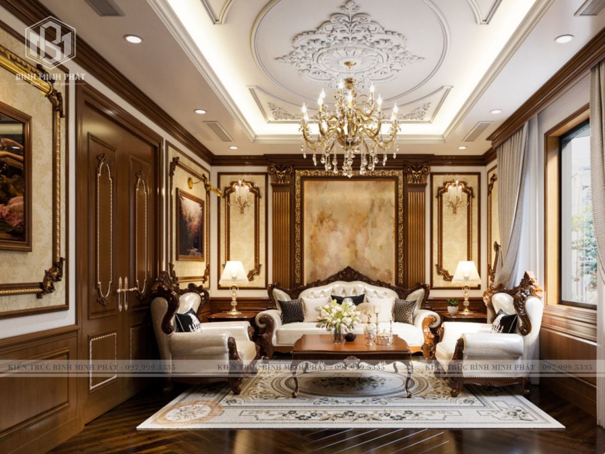 Ngay từ không gian phòng khách, chúng ta có thể dễ dàng nhận ra được sự sang trọng và xa hoa như phong cách cổ điển. Toàn bộ trần đều được ốp gỗ gõ đỏ với các đường phào chỉ tinh tế ghi dấu ấn trên những mặt phẳng của tường, trần và những đường cong tinh tế trên các món đồ nội thất đắt giá.