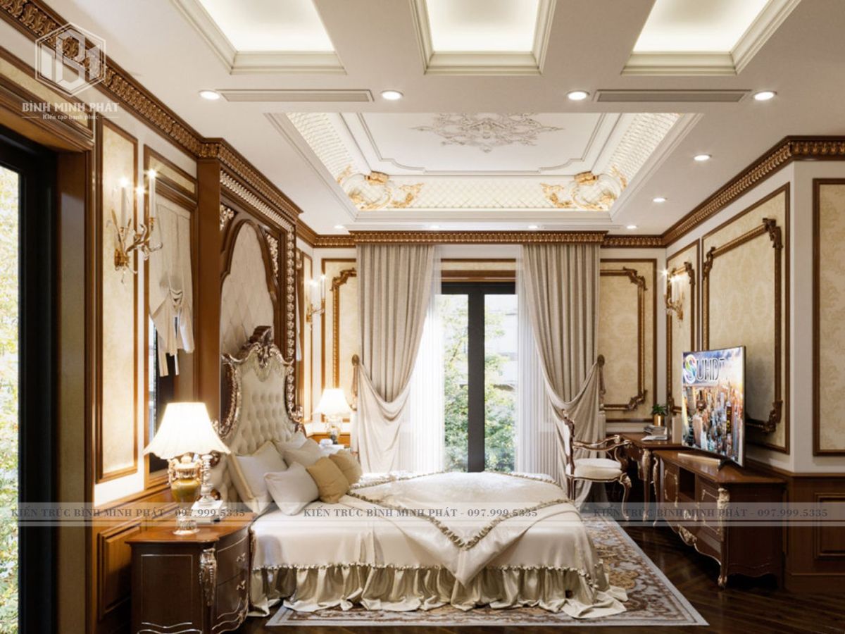 Căn phòng ngủ sử dụng các món đồ nội thất bằng gỗ, tạo nên sự đẳng cấp và ấm áp cho không gian thư giãn của gia chủ. Giường ngủ tân cổ điển với các họa tiết chạm khắc tinh tế cùng bộ ga màu trắng sữa sang trọng, là khu vực tuyệt vời để nghỉ ngơi sau những giờ làm việc mệt mỏi và căng thẳng.