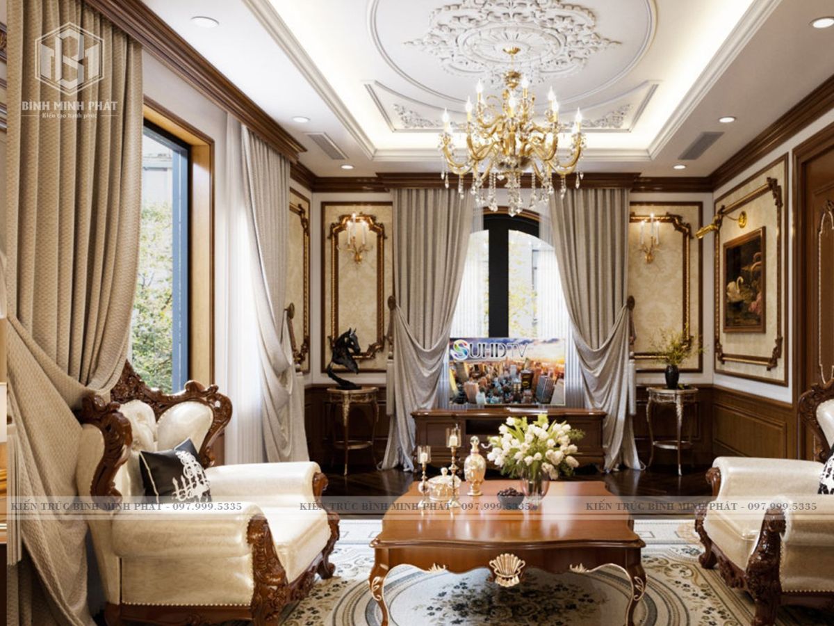 Với vẻ ngoài kiến trúc sang trọng được thiết kế theo phong cách tân cổ điển, chính vì vậy khi thiết kế nội thất Bình Minh Phát cũng sử dụng màu sắc cổ điển để tạo sự đồng bộ cho tổng thể. Mẫu nội thất cổ điển biệt thự 3 tầng NTCD05 mang vẻ đẹp sang trọng thu hút mọi ánh nhìn.