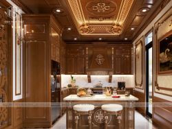 Hệ thống tủ bếp 2 tầng cũng được sử dụng gỗ gõ cao cấp có độ bền chắc, vân gỗ đẹp trường tồn với thời gian. Kích thước tủ bếp đã được các KTS của chúng tôi tính toán chuẩn thước lỗ ban để từ đó mang lại cho gia đình sự may mắn và bình an. Trần nhà được thiết kế giật cấp với phào gỗ dát vàng chạy quanh trần. Hệ thống đèn chiếu sáng hắt khe giúp cho thiết kế phòng bếp ăn thêm nổi bật, nhẹ nhàng.