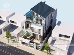 Thiết kế biệt thự 3 tầng hiện đại đẹp phá cách với hệ mái chéo đặc biệt cùng không gian kiến trúc hoàn toàn mới lạ. Sáng tạo những khối hình trong toán học để mang đến một không gian mặt tiền nổi bật, khác biệt hoàn toàn với hàng trăm công trình nhà ở trên cùng khu phố. Bên cạnh đó, ngôi nhà 3 tầng còn được thiết kế thêm hệ thống sân vườn đẹp mắt được bài trí theo phong thủy để làm dịu đi những nét khỏe khoắn trong bố cục kiến trúc. Đây là một điểm cộng để gia tăng tính thẩm mỹ và chinh phục hoàn toàn trái tim của gia đình ông Nam ở Hạ Long.