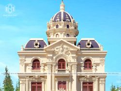 Nhìn vào tổng thể kiến trúc của mẫu biệt thự lâu đài 3 tầng gây ấn tượng và thu hút bởi yếu tố khối hình kiến trúc, tiếp đến là màu sắc, các chi tiết trang trí ngoại thất: phào chỉ, gờ, chi tiết mũ vương miện, trụ cột, sảnh chính – phụ,... Lâu đài hiện lên nổi bật với kết cấu đối xứng - Đây là một điểm nhận biết điển hình của kiến trúc cổ điển. Với 3 phân vị đứng, khối chính đua ra phía trước tạo được sự bề thế quyền quý. Lâu đài có sự đan xen thiết kế kiến trúc vừa mang vẻ đẹp hoài cổ cầu kỳ, tinh xảo của kiến trúc cổ điển và có một chút nét đẹp tự do, mới mẻ, tiện nghi của kiến trúc hiện đại