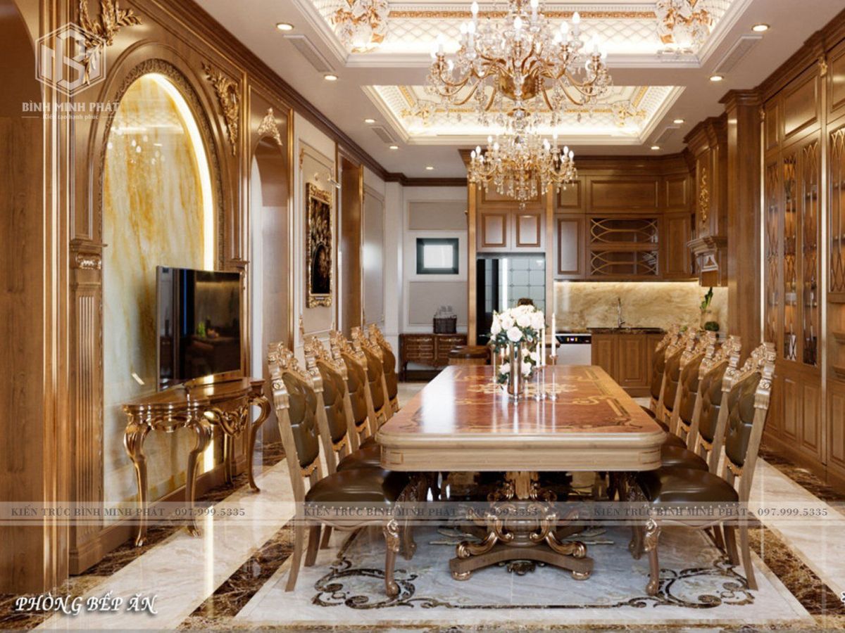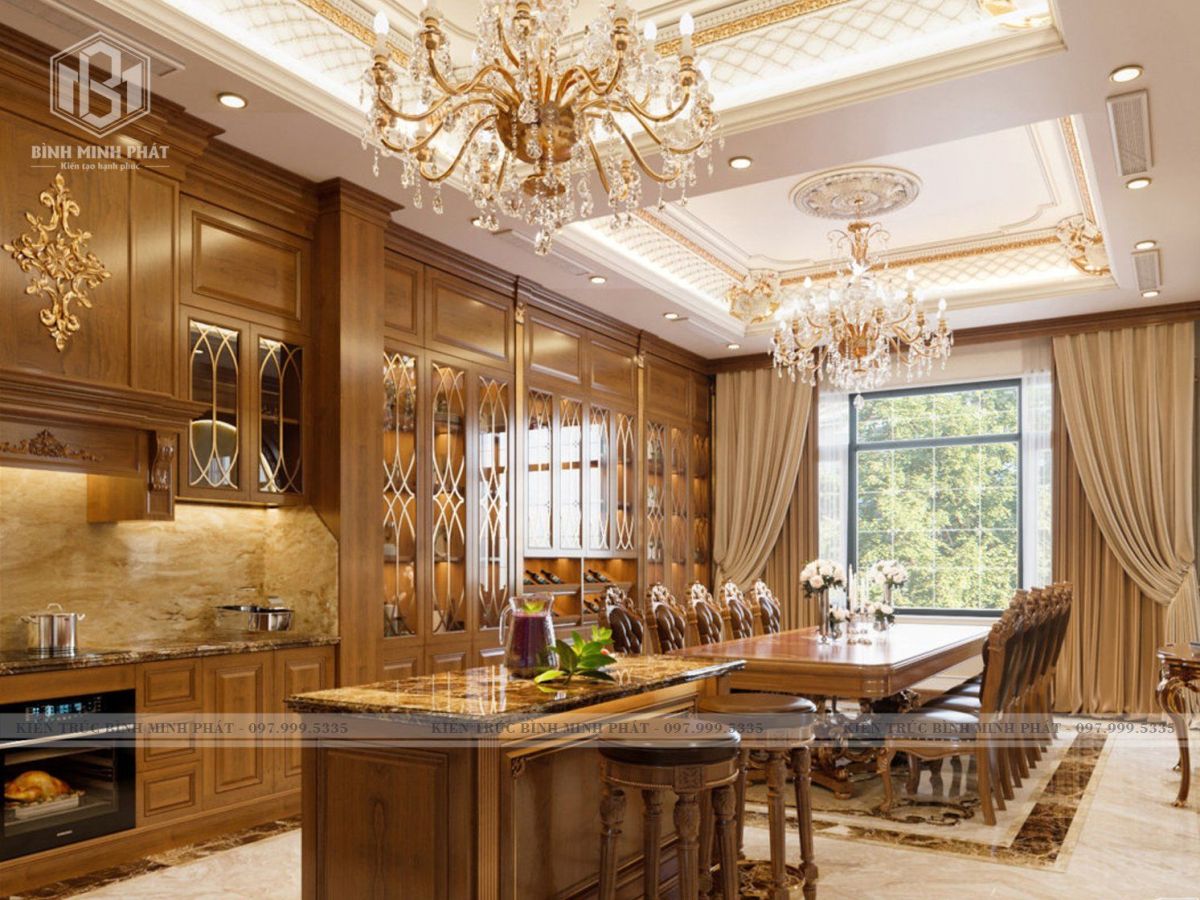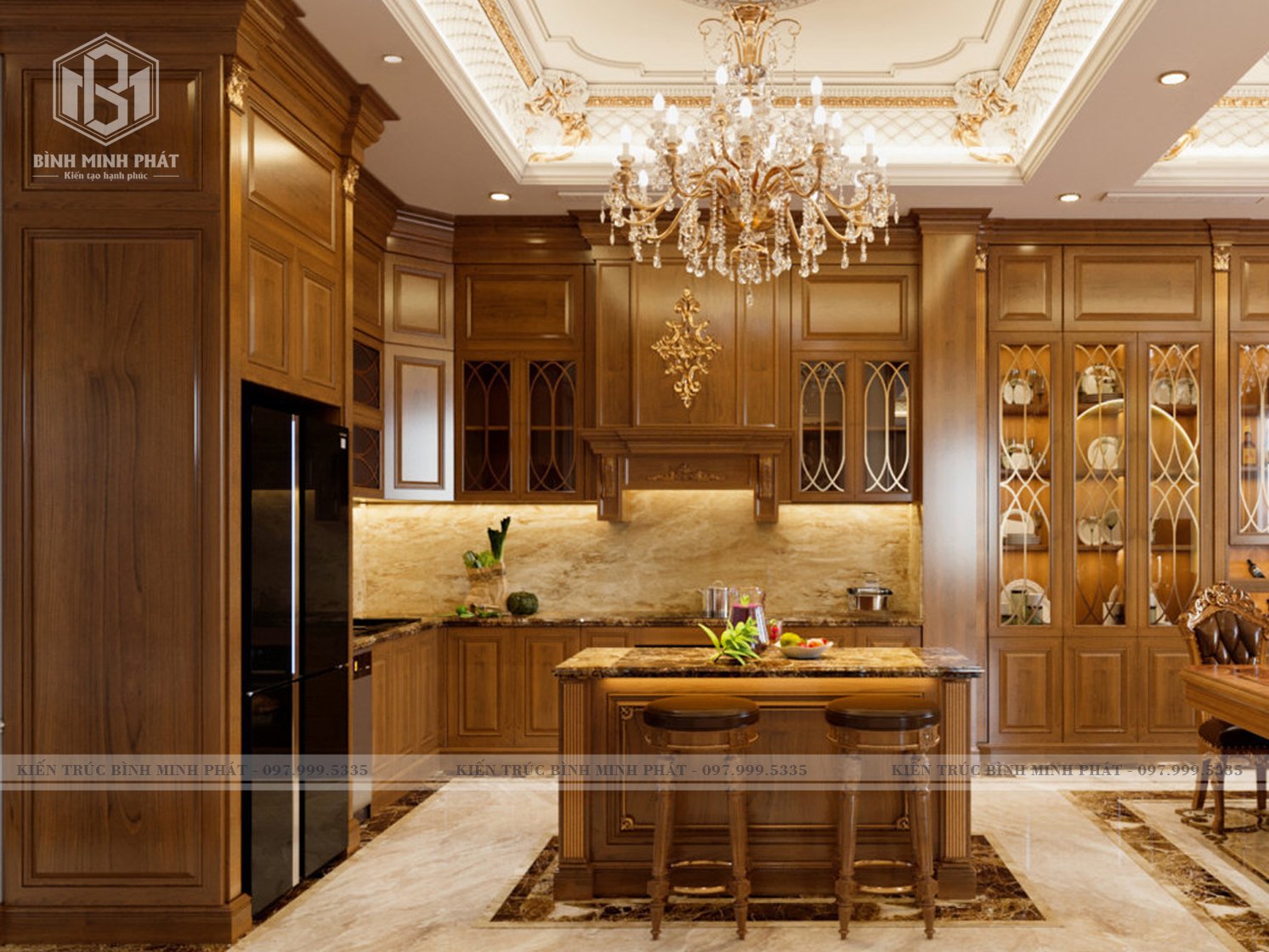 Không gian kiến trúc nội thất phòng bếp cũng vẫn tuân thủ theo đặc trưng của thiết kế nội thất cổ điển. Với tone nâu làm chủ đạo cùng với đèn pha lê màu vàng đã tạo nên sự tinh tế, sắc sảo cho không gian phòng bếp.