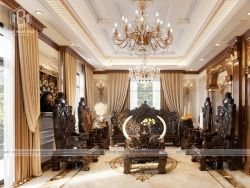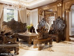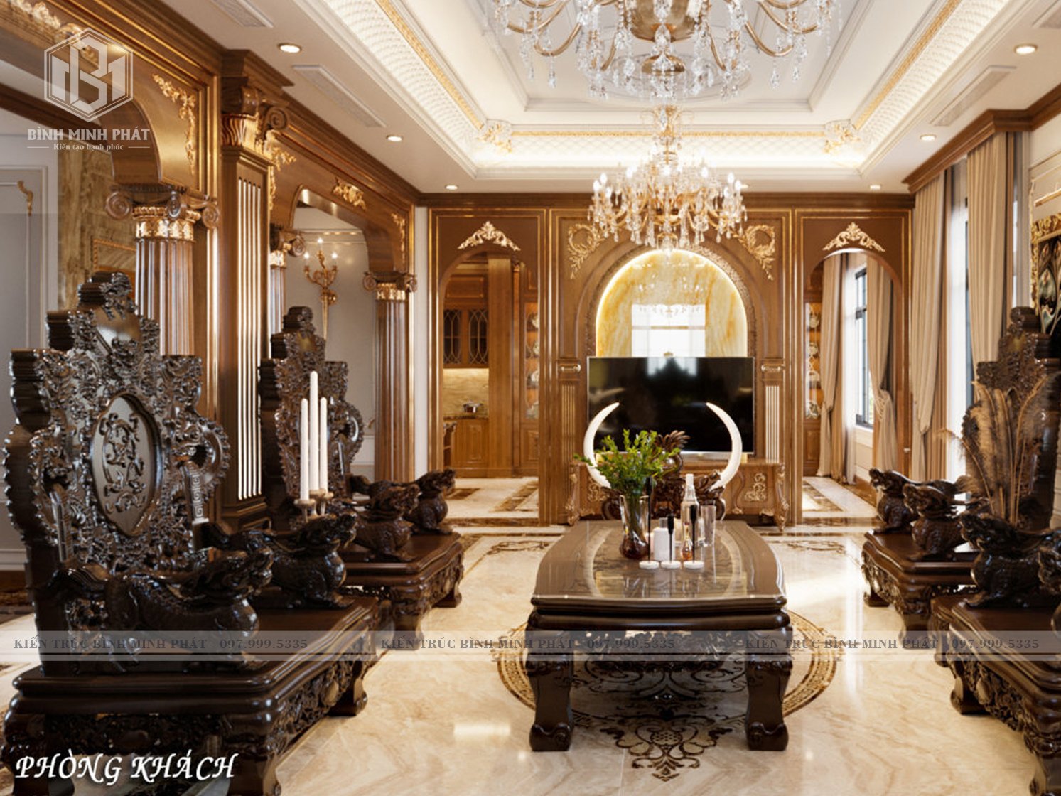 Toàn bộ không gian nội thất phòng khách sử dụng chất liệu gỗ tự nhiên cao cấp, mang đến sự sang trọng, đẳng cấp cho ngôi nhà. Không khí trầm ấm đặc trưng, vẻ đẹp xa hoa lộng lẫy đậm chất vương giả chính là nét đặc trưng của phong cách này. Hệ họa tiết hoa văn trang trí với những đường nét cầu kỳ, tinh xảo mang lại vẻ đẹp mỹ quan cho toàn bộ không gian.