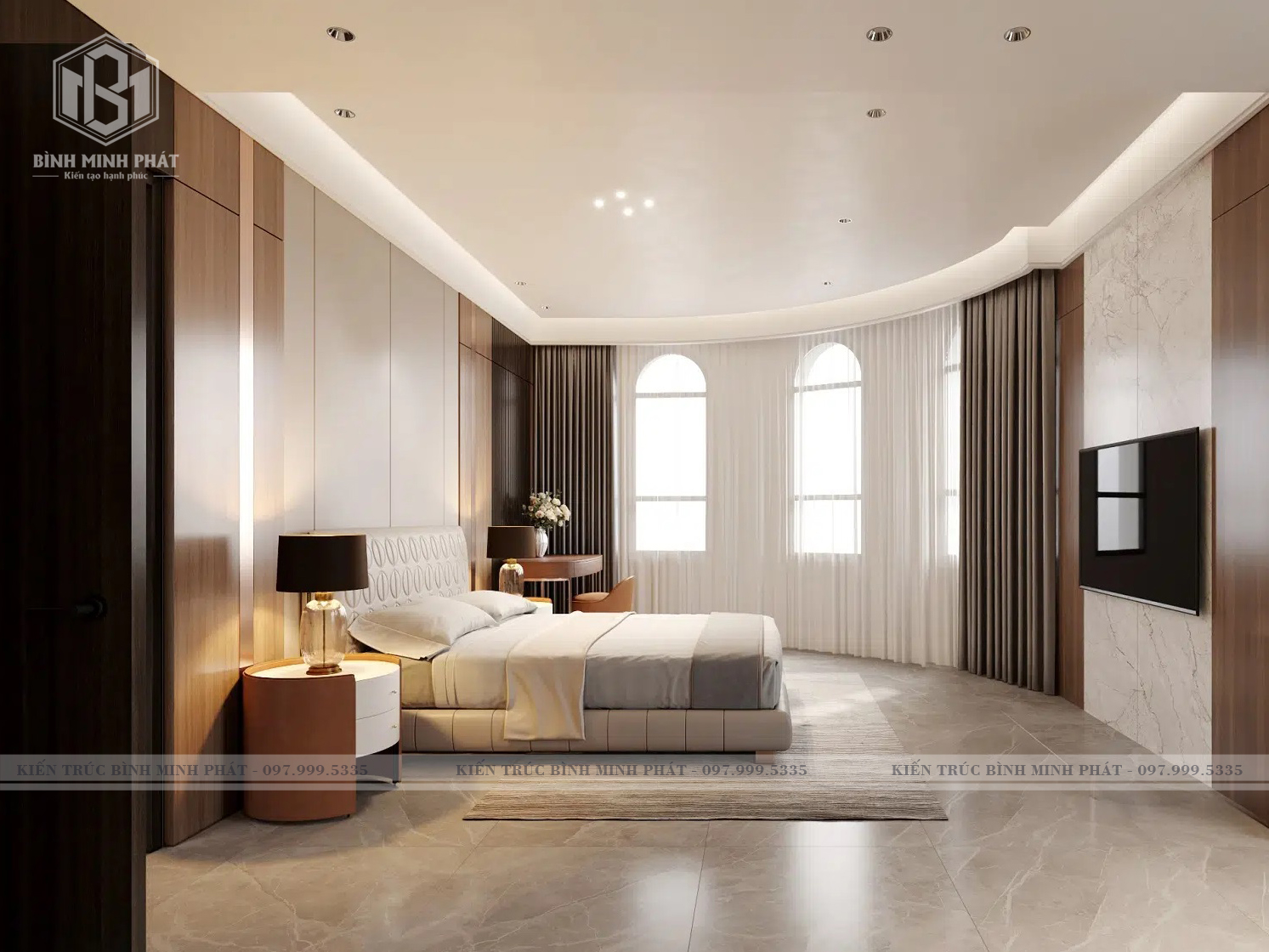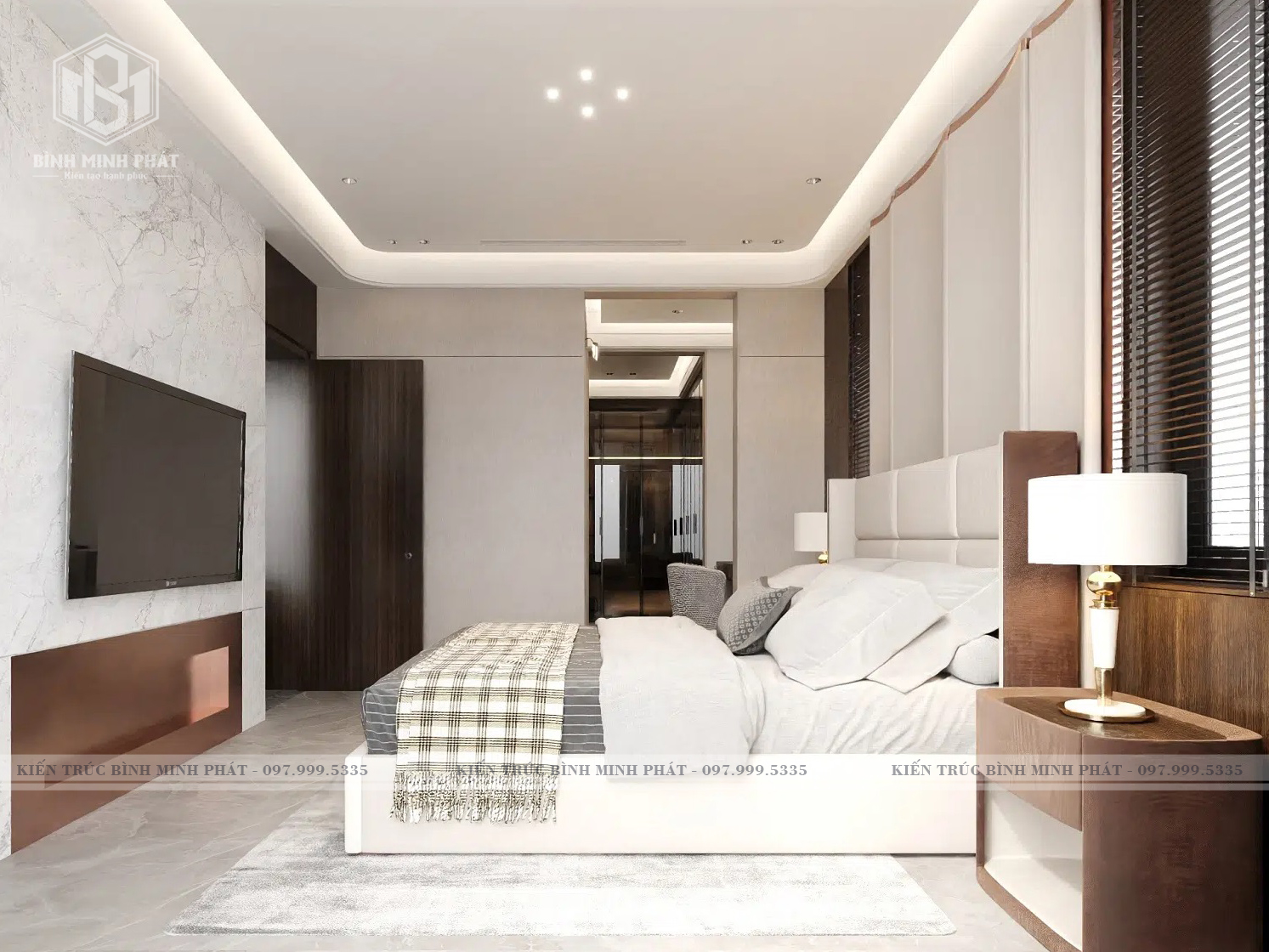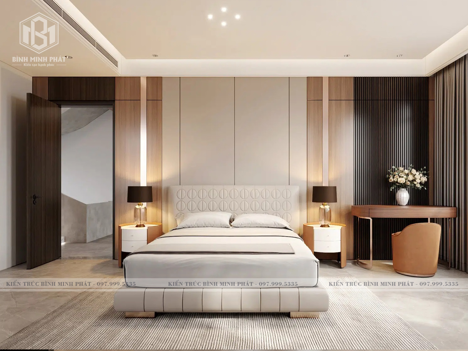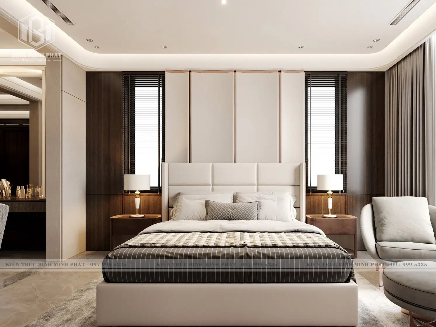 Phòng ngủ là không gian nghỉ ngơi riêng tư của mỗi thành viên trong gia đình. Vì vậy, phòng ngủ cũng cần được đầu tư, trang trí để mang lại một không gian nghỉ ngơi thoải mái. Căn biệt thự của gia đình ông Long thiết kế với 4 phòng ngủ. Trong đó có 2 phòng ngủ VIP, 1 phòng ngủ thường và 1 phòng ngủ giúp việc. Các kiến trúc sư của Bình Minh Phát đã lên ý tưởng thiết kế nội thất phòng ngủ theo sở thích của từng thành viên.