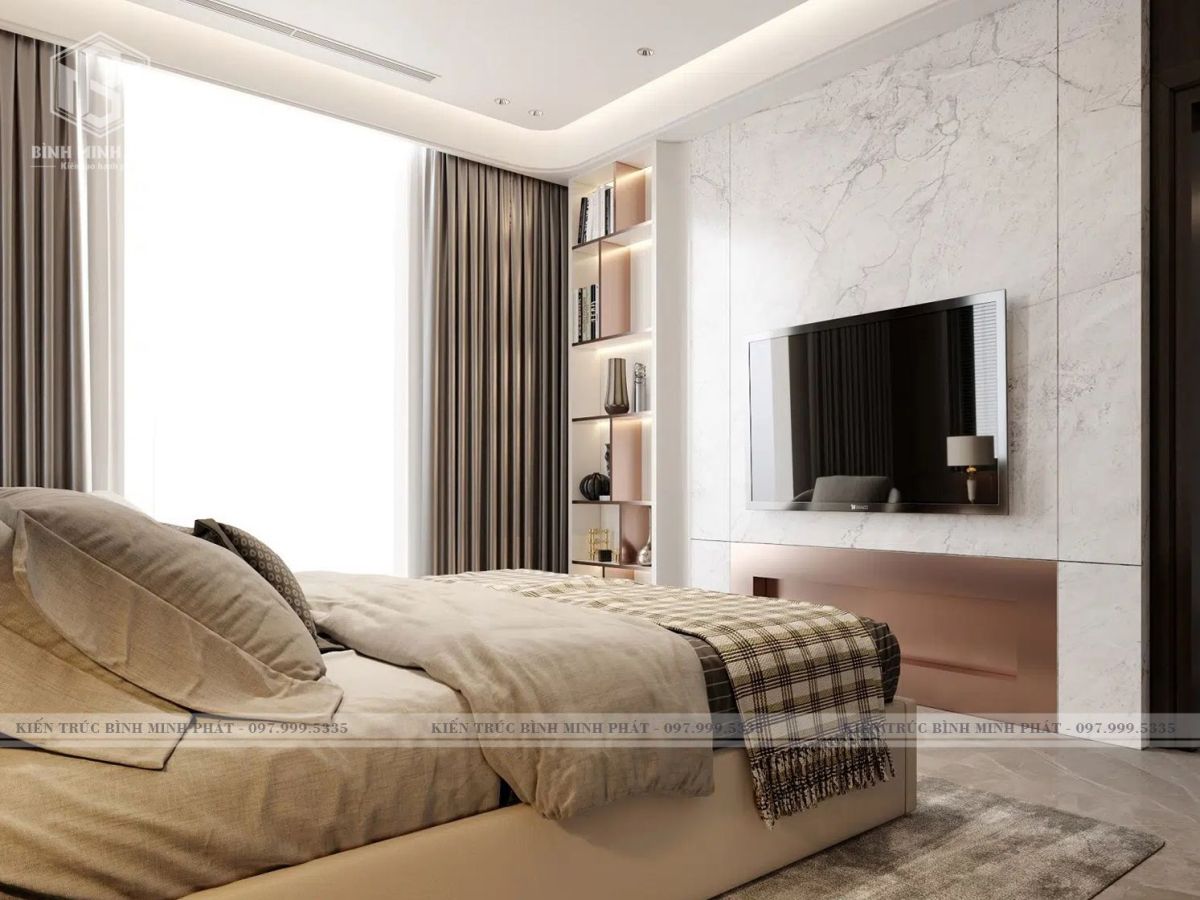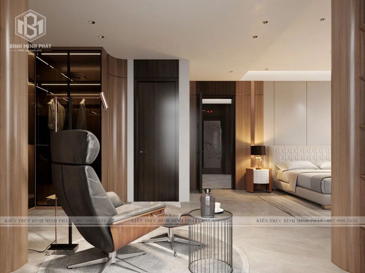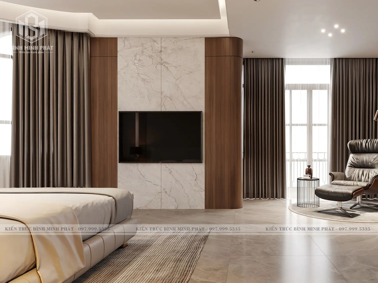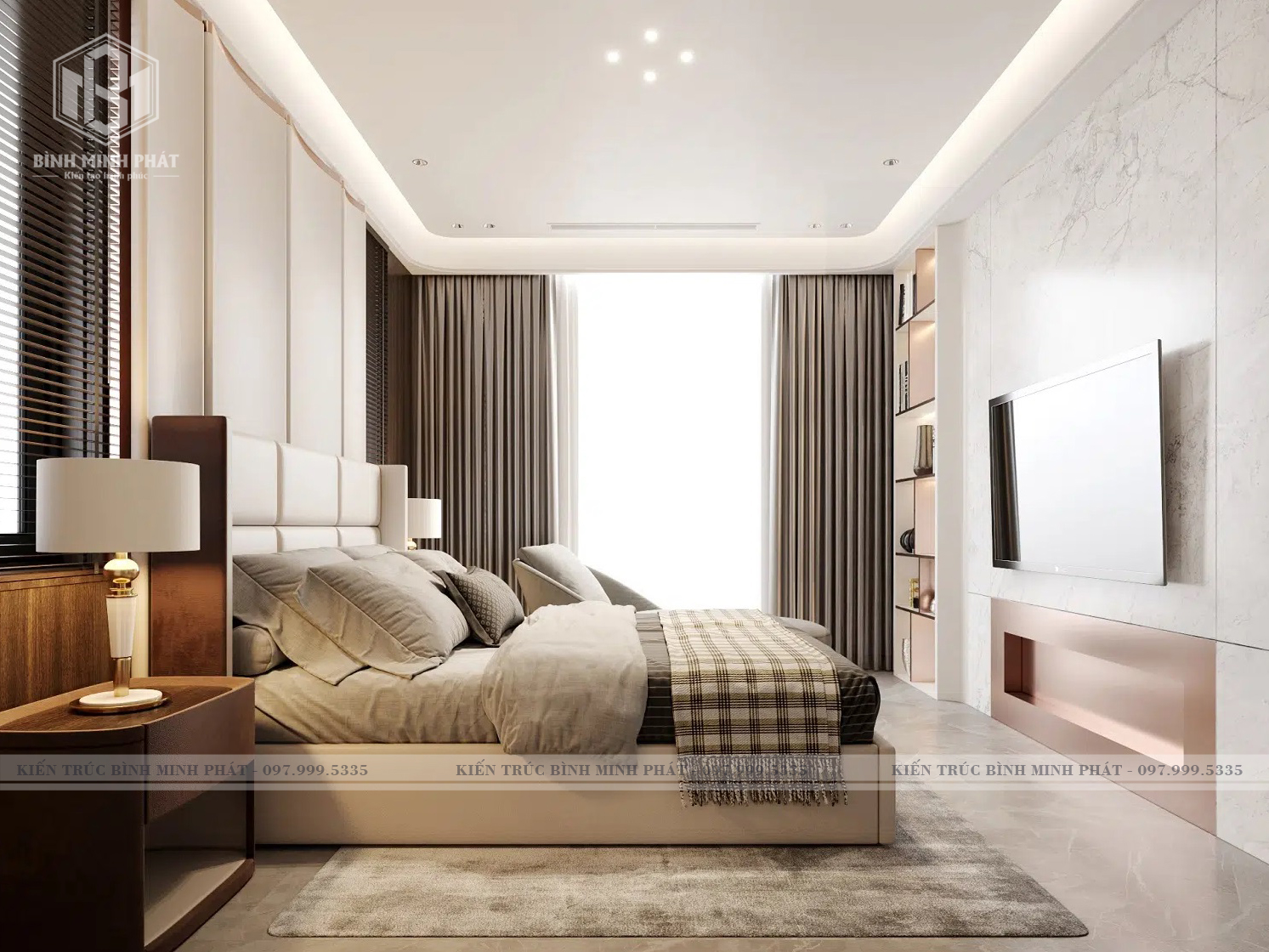 Phòng ngủ là không gian nghỉ ngơi riêng tư của mỗi thành viên trong gia đình. Vì vậy, phòng ngủ cũng cần được đầu tư, trang trí để mang lại một không gian nghỉ ngơi thoải mái. Căn biệt thự của gia đình ông Long thiết kế với 4 phòng ngủ. Trong đó có 2 phòng ngủ VIP, 1 phòng ngủ thường và 1 phòng ngủ giúp việc. Các kiến trúc sư của Bình Minh Phát đã lên ý tưởng thiết kế nội thất phòng ngủ theo sở thích của từng thành viên.