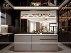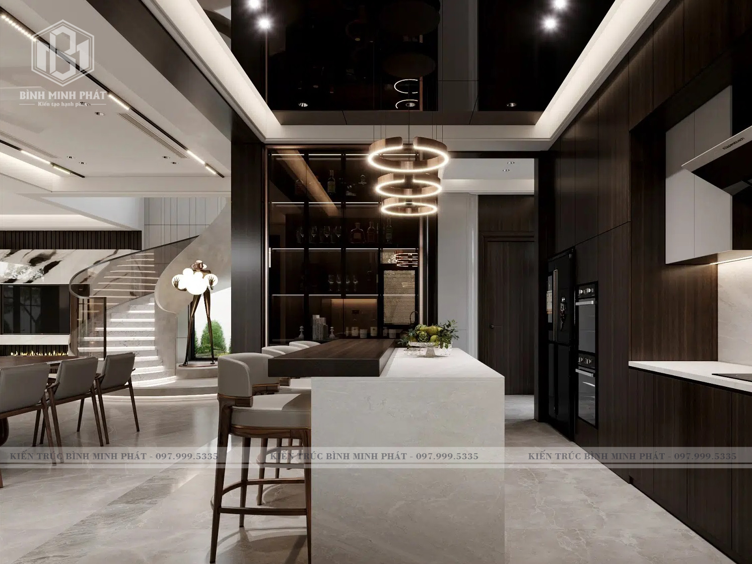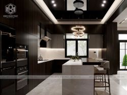 Khác với phòng khách, khu vực bếp có tông màu chủ đạo là màu nâu trầm của nội thất gỗ óc chó và màu đen của các thiết bị nhà bếp hiện đại. Khu vực phòng bếp được trang trí nội thất hiện đại và thông minh. Tận dụng không gian bằng cách sử dụng hệ tủ bếp kịch trần và kệ dưới bếp để lưu trữ đồ dùng nhà bếp. Hệ thống tủ và hộc kéo thông minh đem lại sự thuận tiện nhất cho người nội trợ.