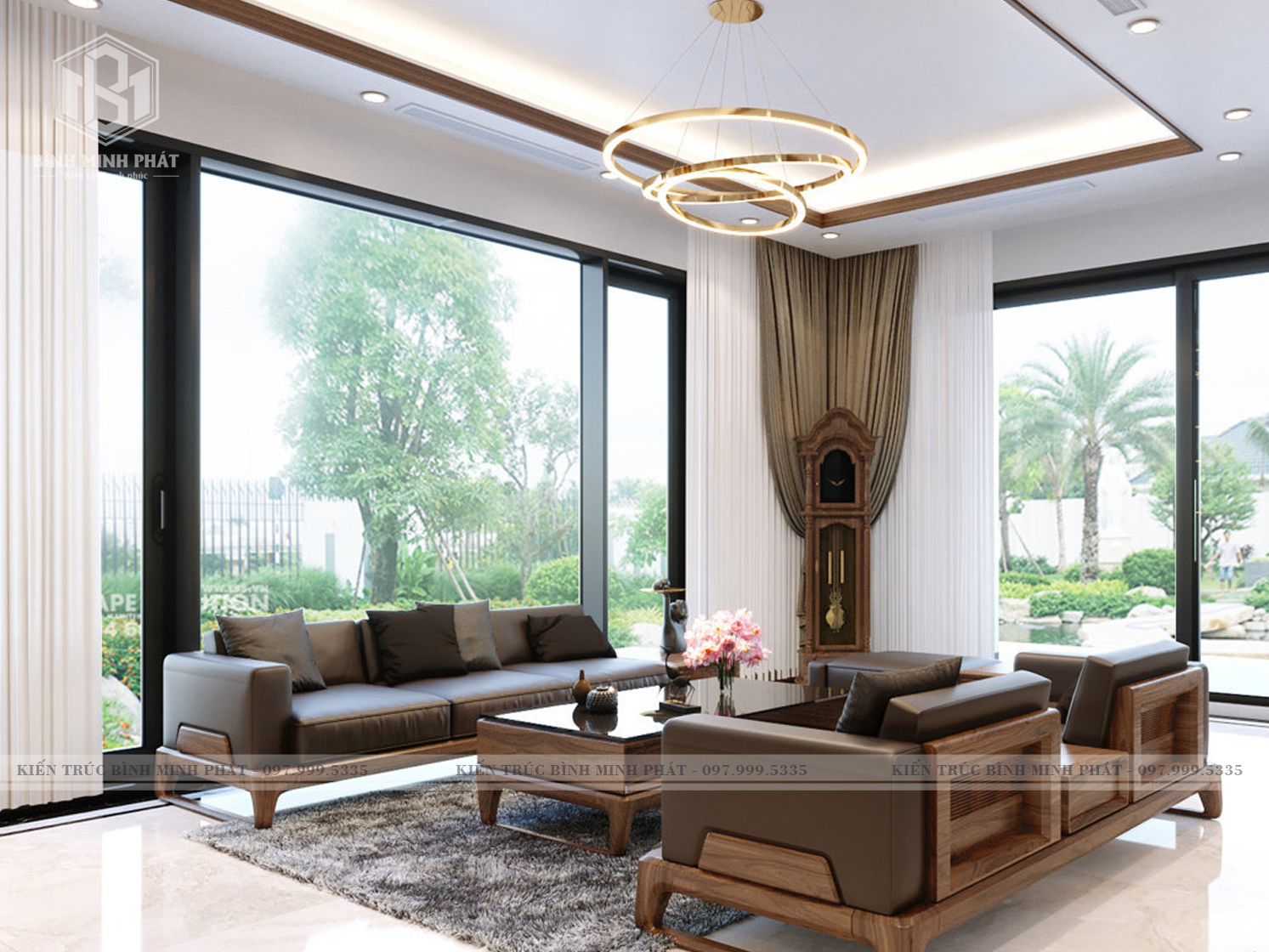 Với màu sắc nâu trầm vân gỗ đặc trưng của gỗ óc chó mang lại sự ấm áp, sang trọng mà không kém phần hiện đại cho không gian sống. Nổi bật trong phòng khách là bộ bàn ghế sofa. Thiết kế của nó thực sự độc đáo và nổi bật, mang đến những nét phá cách mới so với những mẫu ghế thông thường. Sự kết hợp của nội thất gỗ óc chó với đệm da cao cấp nhập khẩu là một lựa chọn hoàn hảo nhất, vừa thân thiện với môi trường tự nhiên, vừa tinh tế và sang trọng. Điều này tạo ra những trải nghiệm mới lạ và đặc biệt cho những gia đình sở hữu nó. Mặt bàn trà của chiếc sofa được làm từ kính cường lực, mang lại sự sang trọng và độ bền. Kính cường lực không chỉ đảm bảo tính an toàn cao mà còn tạo ra hiệu ứng ánh sáng đẹp mắt.