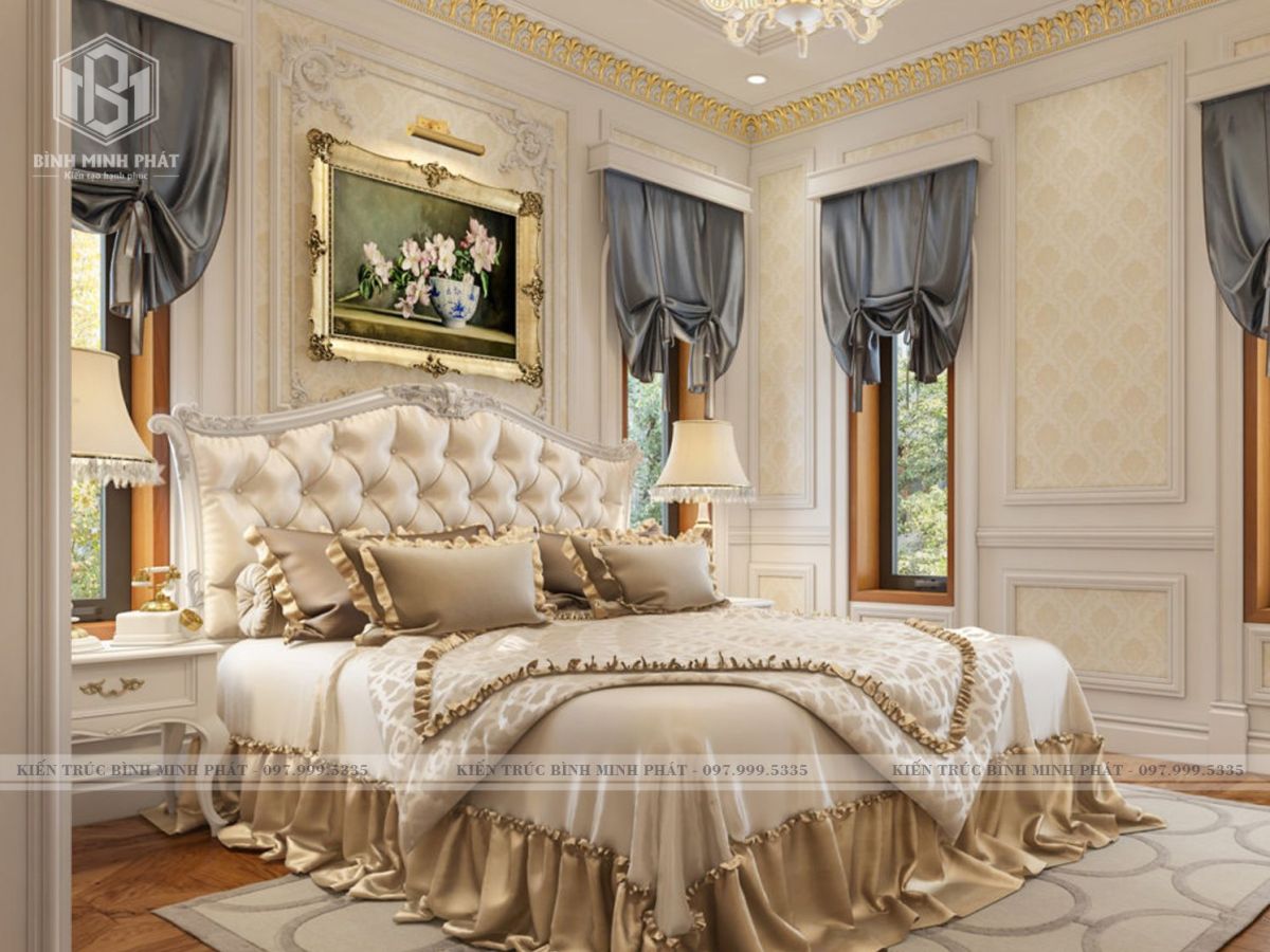Nội thất phòng ngủ này theo phong cách tân cổ điển nhưng nhẹ nhàng hơn, không gian nhỏ nên thiết kế sẽ tối giản và hướng đến sự thanh lịch. Căn phòng sở hữu gam màu be nhẹ cùng màu trắng tinh khôi đậm chất châu Âu. Các nội thất lẫn màu sắc sơn tường hài hòa trong từng chi tiết hơn thế nội thất gỗ mang lại cảm giác ấm áp hơn rất nhiều.