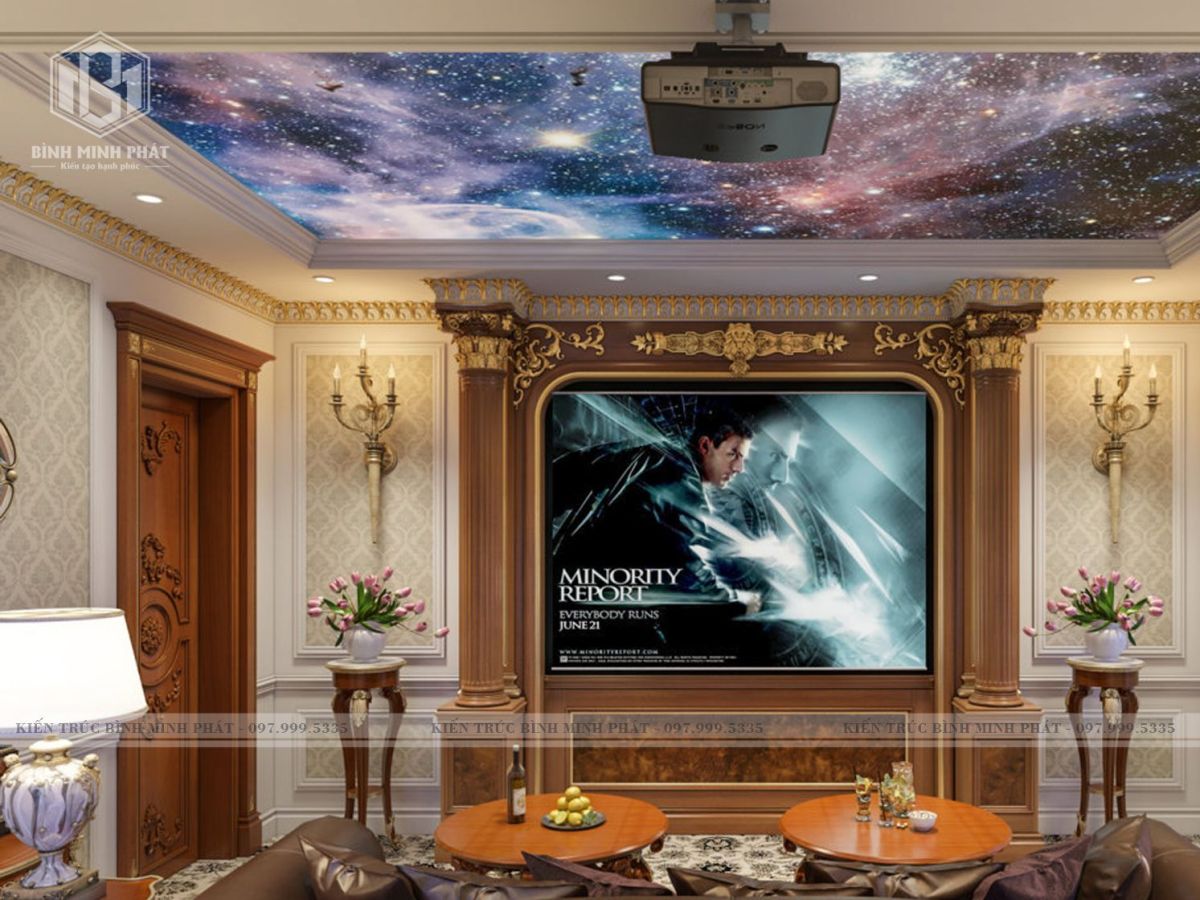 Đặc điểm đầu tiên trong thiết kế của kiến trúc cổ điển biệt thự này chính là sự cân bằng và đối xứng. Trong từng không gian trong phòng chúng ta thấy được sự cân đối theo một tỷ lệ rất hoàn hảo tạo nên chỉnh thể thống nhất, có bố cục rõ ràng. Các không gian thiết kế theo hướng mở, khu vực kệ tivi nổi bật với vách CNC kim loại với kiểu dáng sang trọng.